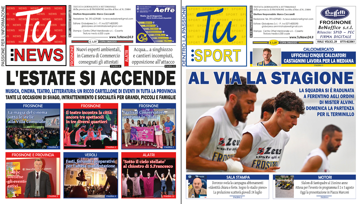 In distribuzione oggi e domani le nuove edizioni dei giornali free press della Ciociaria. “Tu News” con tanta attualità, cronaca, politica, inchiesta, cultura e spettacolo della provincia di Frosinone. E in più “Tu Sport”, dedicato al calcio, al basket, al volley, ai motori e a tutto il mondo dello sport ciociaro. Non perdete la vostra edizione cartacea reperibile nelle maggiori edicole o in bar, pasticcerie, pub, centri commerciali, palazzi istituzionali, negozi e hotel!