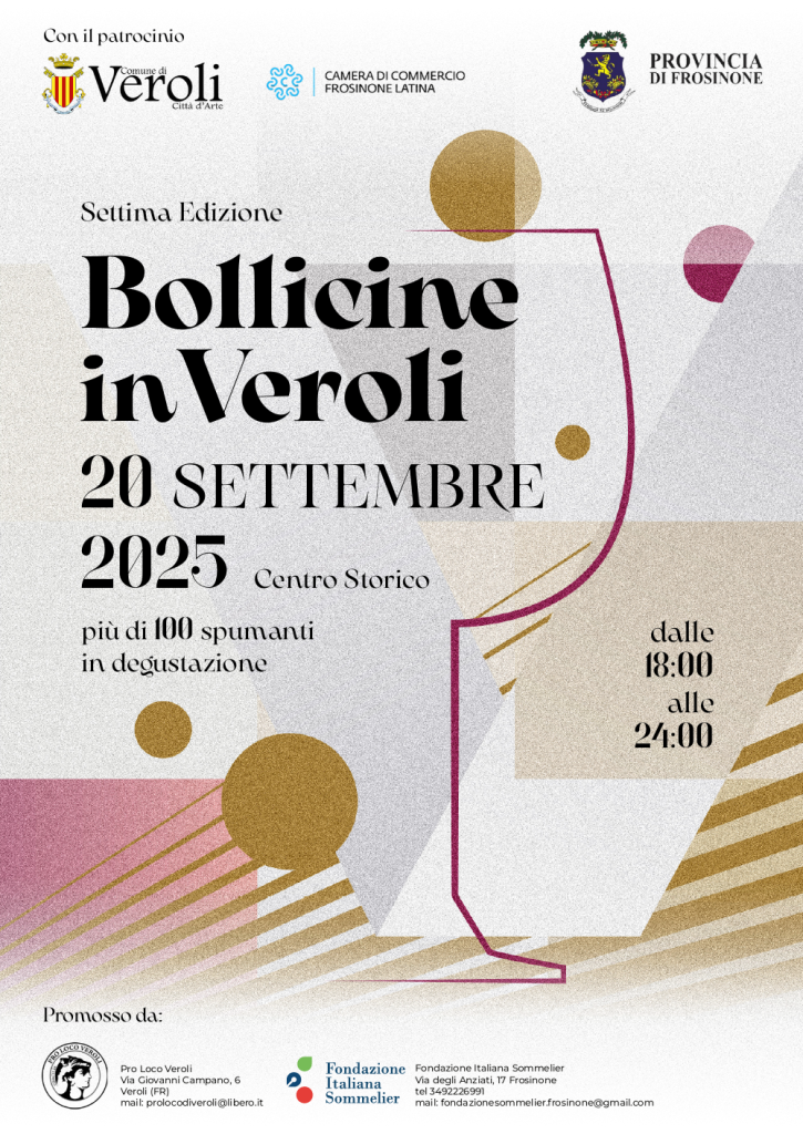 Dalle 18 alle 24 del 20 settembre, il Centro storico si tramuterà nel teatro del gusto e dell’eccellenza grazie al lavoro della Pro Loco di Veroli e della Fondazione Italiana Sommelier, con il patrocinio della Provincia di Frosinone. Le cinque aree degustazione allestite tra il Chiostro di Sant’Agostino, Piazza Duomo, il Chiostro dei Canonici, la Terrazza del Vescovado e Piazza Palestrina saranno affidate ad esperti sommelier che sapranno accompagnare i partecipanti in un interessante percorso tra oltre 100 spumanti da assaporare.