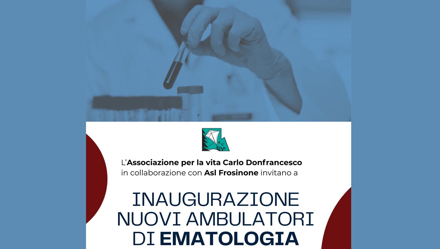 L’Associazione per la Vita Carlo Donfrancesco, in collaborazione con la ASL di Frosinone, è lieta di comunicare la cerimonia di inaugurazione dei nuovi ambulatori di Ematologia, situati al secondo piano della Palazzina “Q” in via Armando Fabi (Ospedale F. Spaziani di Frosinone).