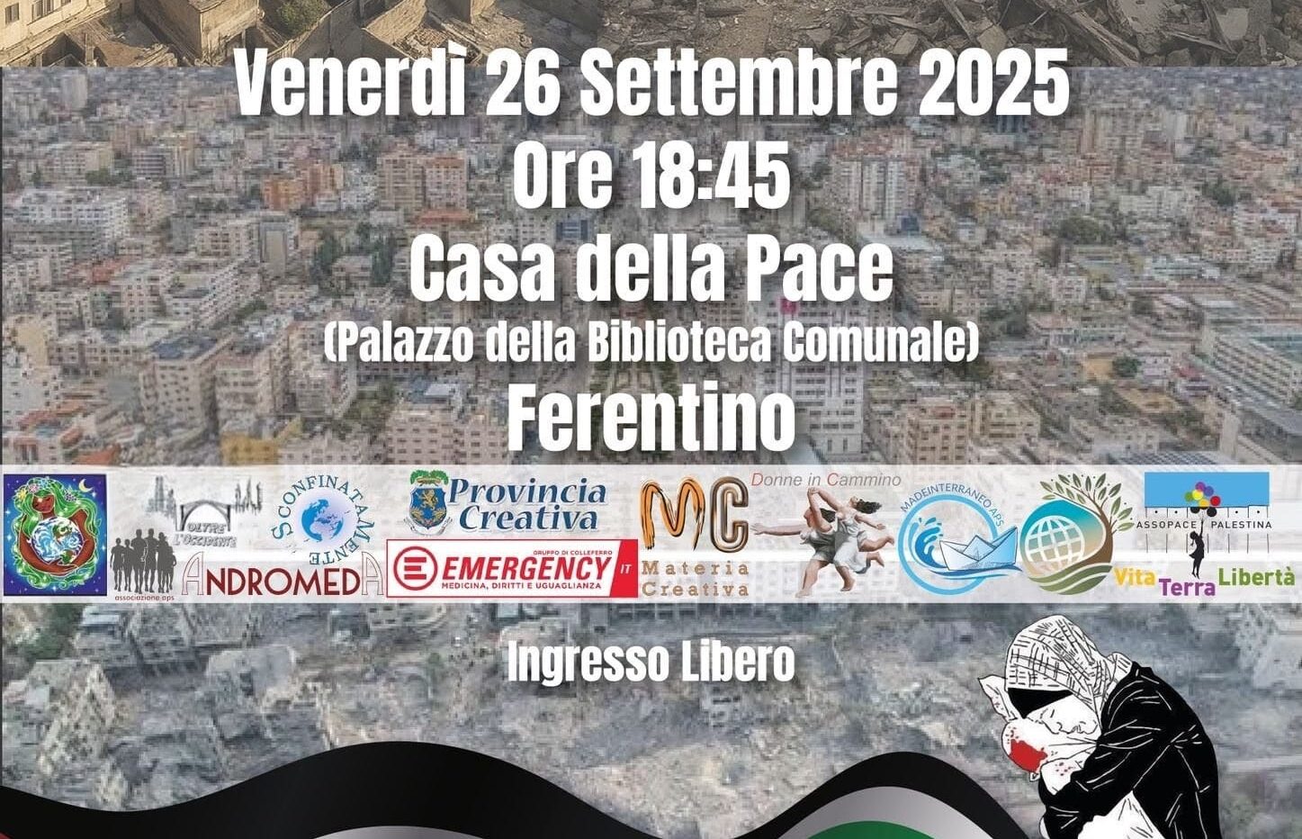 Il primo appuntamento pubblico sarà la manifestazione “Ferentino per Gaza: per una pace giusta in Palestina”, in programma venerdì 26 settembre, a cui invitiamo a partecipare associazioni, studenti, istituzioni, forze politiche e tutti i cittadini che vogliono mostrare la loro indignazione per quanto sta accadendo in Medioriente, per condividere voci, parole e suoni in sostegno della pace e dei diritti del popolo palestinese.