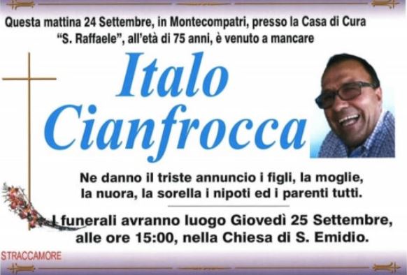 I funerali per dare ad Italo Cianfrocca l’ultimo saluto si svolgeranno domani (giovedì 25 settembre) alle 15 presso la chiesa della contrada di Sant’Emidio, zona di origine del 75enne scomparso.