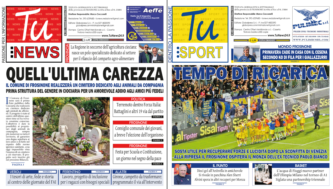 In distribuzione oggi e domani le nuove edizioni dei giornali free press della Ciociaria. “Tu News” con tanta attualità, cronaca, politica, inchiesta, cultura e spettacolo della provincia di Frosinone. E in più “Tu Sport”, dedicato al calcio, al basket, al volley, ai motori e a tutto il mondo dello sport ciociaro. Non perdete la vostra edizione cartacea reperibile nelle maggiori edicole o in bar, pasticcerie, pub, centri commerciali, palazzi istituzionali, negozi e hotel!
