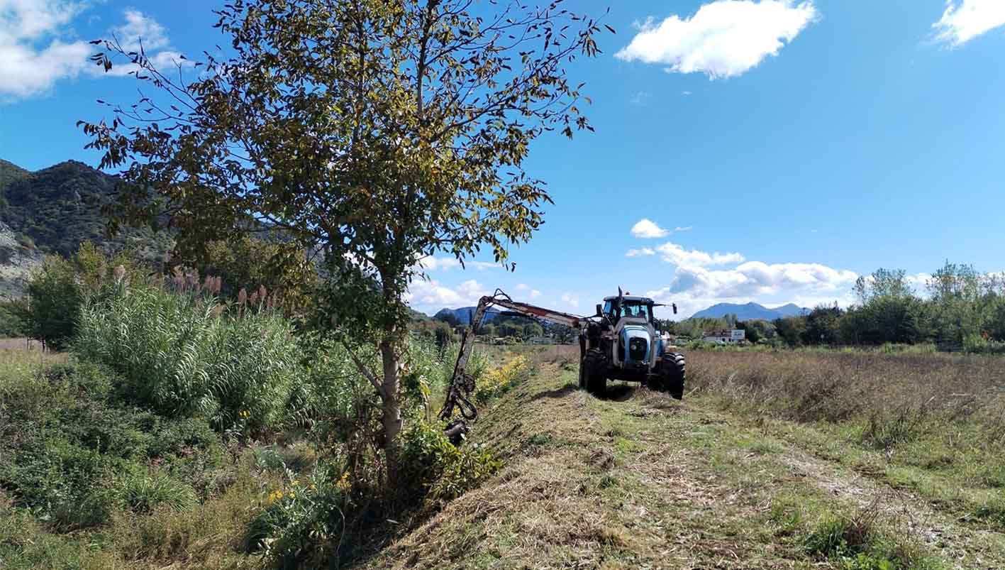 · il decespugliamento e l’espurgo della rete scolante irrigua Sx Gari nel Comune di Cassino, in località Colle Canne e Collecedro, e nel Comune di Cervaro in località Santa Lucia con escavatori cingolati da 100 q.li e 60 q.li;