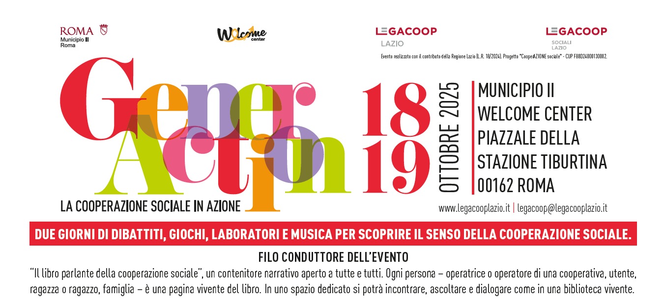 Il 18 e 19 ottobre, nello spazio antistante il Welcome Center in Piazzale della Stazione Tiburtina, la cooperazione sociale si racconta alla città con “Il libro parlante della cooperazione sociale”, un evento aperto a tutte e tutti, pensato come una grande biblioteca vivente in cui ogni persona è una pagina da leggere: operatrici e operatori, utenti, giovani, famiglie. Promosso dalla cooperazione sociale romana di Legacoop, l’appuntamento vuole offrire un’occasione di incontro e confronto tra cittadini, istituzioni e realtà sociali. In due giornate di attività si alterneranno laboratori creativi, momenti istituzionali, performance, musica e gastronomia, per dare corpo e voce alla pluralità di esperienze che compongono il tessuto solidale della Capitale.