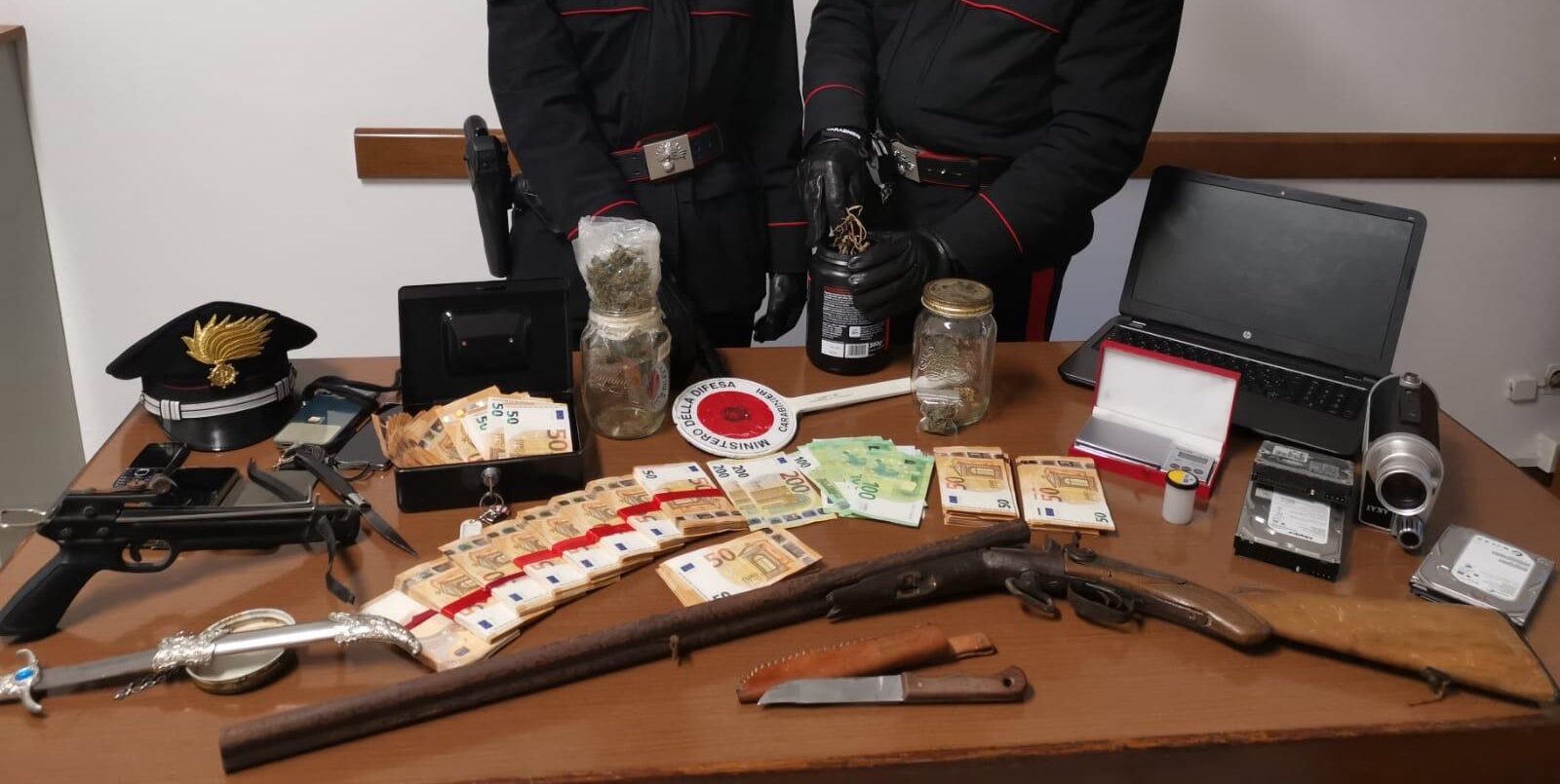 In casa sono stati trovati vari DVD dai contenuti pedo – pornografici, sequestrati hard disk, personal computer, nonché varie armi illecitamente detenute, più di 50 grammi di marijuana suddivisa in dosi pronte per essere messe in commercio, vari semi di canapa indiana e oltre 30.000,00 euro in banconote di vario taglio, sicuramente provento di attività illecite.