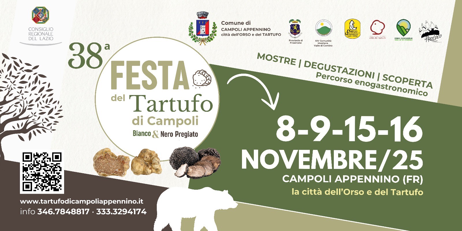 Il Comune di Campoli Appennino e la Knock Srl, con il contributo del Consiglio Regionale del Lazio, della Provincia di Frosinone, della XIV Comunità Montana Valle di Comino, del Centro Servizi del Parco Nazionale d’Abruzzo, Lazio e Molise “Orsa Maggiore” rifugio escursionistico, dell’Associazione Nazionale Città del Tartufo e la collaborazione della Pro Loco di Campoli Appennino, presentano la 38ª edizione della Festa del Tartufo Bianco e Nero Pregiato, una manifestazione che rinnova il legame profondo tra la comunità e il suo prodotto simbolo.