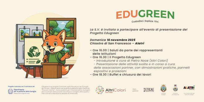 Dal 12 al 19 novembre, presso il Chiostro di San Francesco ad Alatri, si terrà la mostra-evento del progetto Edugreen, un’iniziativa promossa dalla Cooperativa sociale Altri Colori, con il patrocinio del Comune di Alatri, in collaborazione con i main partner Eticae – Stewardship in Action, i Comuni di Alatri e Collepardo in sinergia con associazioni e realtà locali.