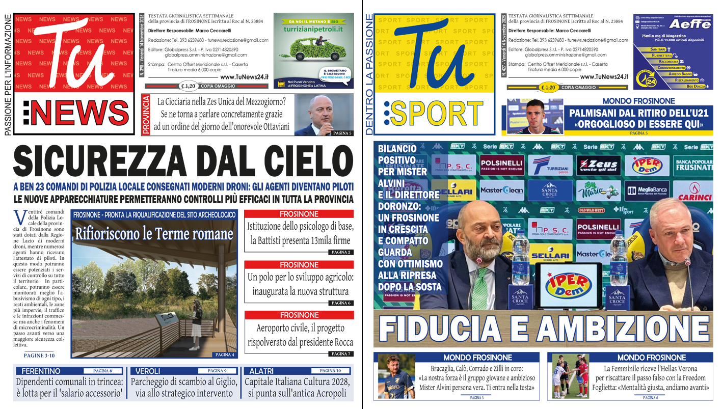 In distribuzione oggi e domani le nuove edizioni dei giornali free press della Ciociaria. “Tu News” con tanta attualità, cronaca, politica, inchiesta, cultura e spettacolo della provincia di Frosinone. E in più “Tu Sport”, dedicato al calcio, al basket, al volley, ai motori e a tutto il mondo dello sport ciociaro. Non perdete la vostra edizione cartacea reperibile nelle maggiori edicole o in bar, pasticcerie, pub, centri commerciali, palazzi istituzionali, negozi e hotel!