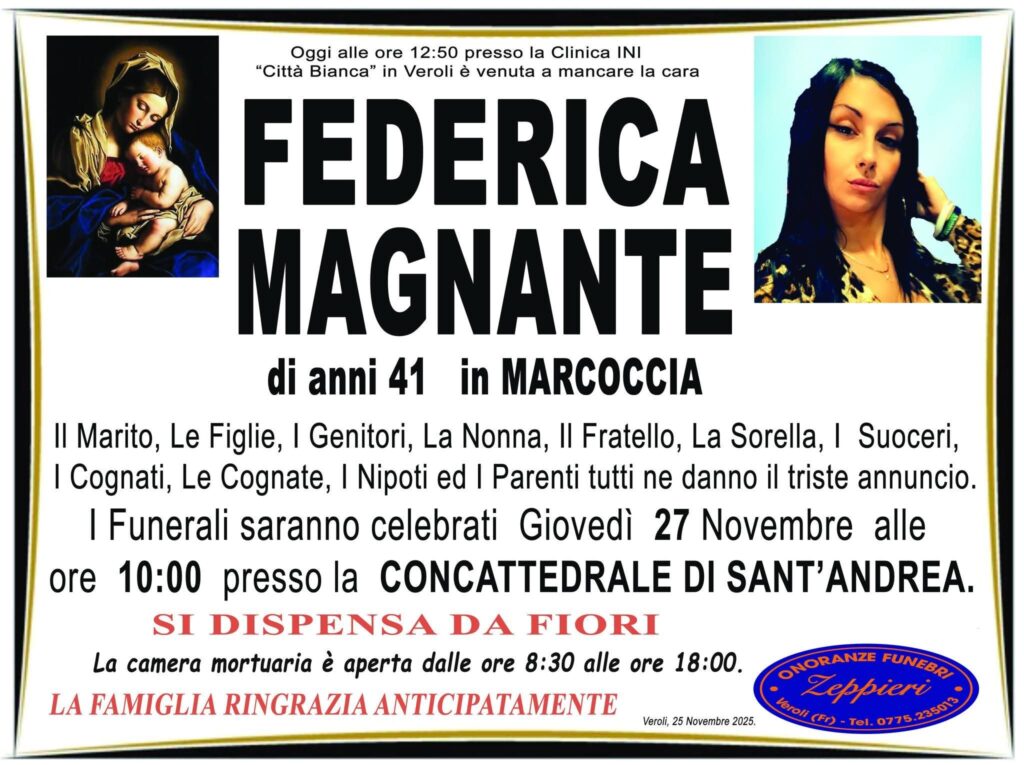Fissati i funerali della 41enne, che si svolgeranno domani, giovedì 27 novembre, alle 10 nella Concattedrale di Sant’Andrea a Veroli. La famiglia rende anche noto che chi vorrà potrà anche dare un ultimo abbraccio a Federica nella camera mortuaria che sarà aperta dalle 8:30 alle 18:00. Alla famiglia della giovane giungano anche le condoglianze della redazione di TuNews.