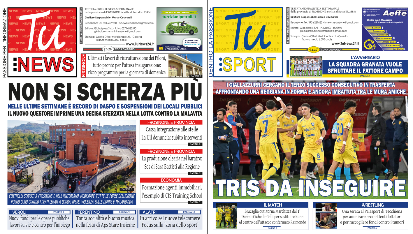 In distribuzione oggi e domani le nuove edizioni dei giornali free press della Ciociaria. “Tu News” con tanta attualità, cronaca, politica, inchiesta, cultura e spettacolo della provincia di Frosinone. E in più “Tu Sport”, dedicato al calcio, al basket, al volley, ai motori e a tutto il mondo dello sport ciociaro. Non perdete la vostra edizione cartacea reperibile nelle maggiori edicole o in bar, pasticcerie, pub, centri commerciali, palazzi istituzionali, negozi e hotel!