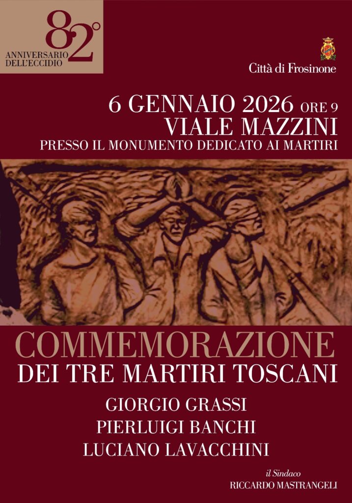 Come ogni anno, l’amministrazione comunale di Frosinone ricorderà Giorgio Grassi, Pier Luigi Banchi e Luciano Lavacchini, passati alla storia come “i tre martiri toscani”. La cerimonia – nell’82° anniversario dell’eccidio – si terrà martedì 6 gennaio alle 9, presso il monumento in viale Mazzini a loro dedicato. I tre giovani furono giustiziati dal plotone d’esecuzione tedesco proprio presso il cosiddetto “curvone”.