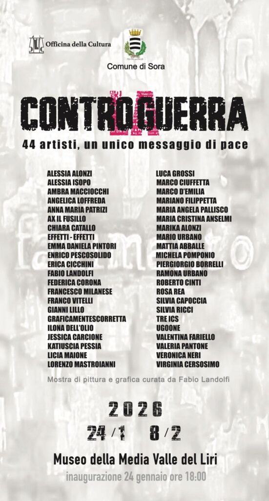 Da sabato prossimo, 24 gennaio, all’8 febbraio 2026 il Museo della Media Valle del Liri di Sora ospiterà la mostra collettiva “CONTRO LA GUERRA”, un progetto artistico e culturale di forte valore civile che coinvolge 44 artisti chiamati a confrontarsi, attraverso il linguaggio visivo, con uno dei temi più drammatici e attuali del nostro tempo. Lo rendono noto il Sindaco Luca Di Stefano ed il Consigliere Comunale delegato alle Politiche Giovanili Francesco Monorchio.