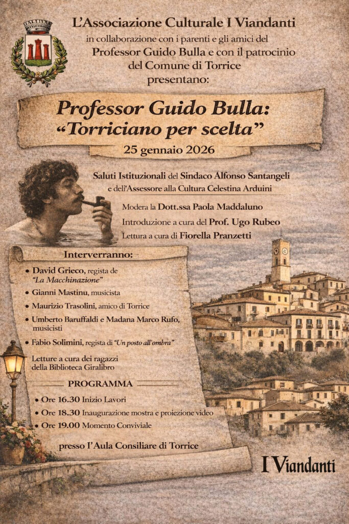 Un convegno dedicato alla memoria del Professor Guido Bulla: si svolgerà domenica prossima, 25 gennaio, organizzato dall’Associazione Culturale I Viandanti in collaborazione con i familiari dell’indimenticato docente e con il patrocinio del Comune di Torrice. Evocativo il titolo dell’appuntamento: “Prof. Bulla… un torriciano per scelta”.