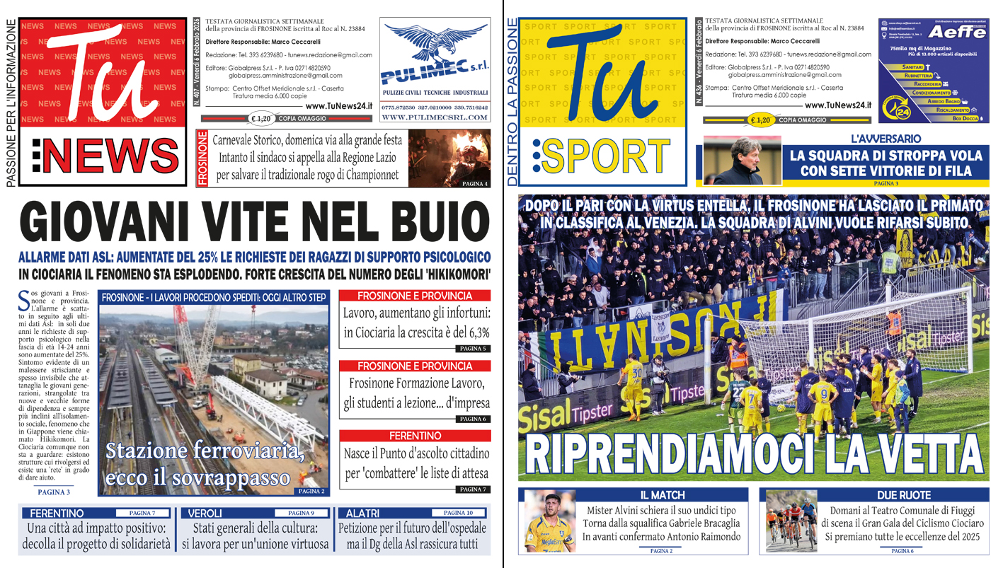 In distribuzione oggi e domani le nuove edizioni dei giornali free press della Ciociaria. “Tu News” con tanta attualità, cronaca, politica, inchiesta, cultura e spettacolo della provincia di Frosinone. E in più “Tu Sport”, dedicato al calcio, al basket, al volley, ai motori e a tutto il mondo dello sport ciociaro. Non perdete la vostra edizione cartacea reperibile nelle maggiori edicole o in bar, pasticcerie, pub, centri commerciali, palazzi istituzionali, negozi e hotel!