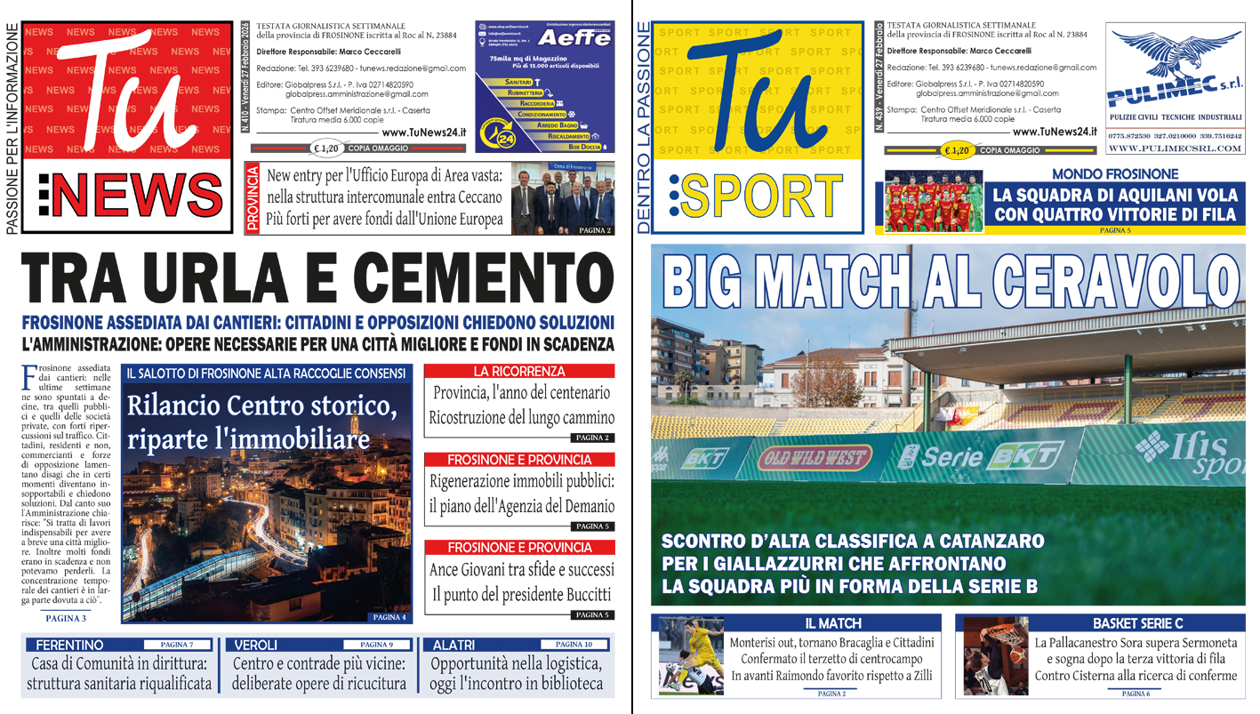 In distribuzione oggi e domani le nuove edizioni dei giornali free press della Ciociaria. “Tu News” con tanta attualità, cronaca, politica, inchiesta, cultura e spettacolo della provincia di Frosinone. E in più “Tu Sport”, dedicato al calcio, al basket, al volley, ai motori e a tutto il mondo dello sport ciociaro. Non perdete la vostra edizione cartacea reperibile nelle maggiori edicole o in bar, pasticcerie, pub, centri commerciali, palazzi istituzionali, negozi e hotel!