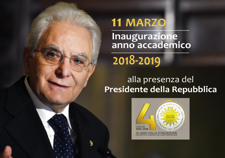 Il Presidente della Repubblica Sergio Mattarella presenzierà all’inaugurazione dell’anno accademico 2018-2019. La cerimonia si svolgerà domani nell’Aula Magna del Palazzo degli Studi del Campus Folcara. Il Capo dello Stato darà il via a una serie di eventi organizzati dall’ateneo, diretto dal Magnifico Rettore Giovanni Betta, per festeggiare il quarantennale della fondazione dell’Università degli Studi di Cassino e del Lazio Meridionale.