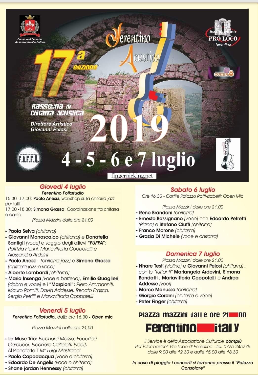 Venerdì 5, stessa ora, stesso luogo, toccherà al Trio Le Muse, Paolo Capodacqua, Edoardo De Angelis, Shane Jordan Hennessy. Si proseguirà sabato 6 luglio, con gli spettacoli di Reno Brandoni, Ernesto Bassignano con Edoardo Petretti e Stefano Ciuffi, Franco Morone e Grazia di Michele. Infine, conclusione veramente di livello, domenica 7 luglio con Peter Finger, Giorgio Cordini, Marco Manusso, Nhare Testi, Giovanni Pelosi, Mariangela Ardovini, Simona Bondatti, Mariavittoria Coppotelli e Andrea Addesse.