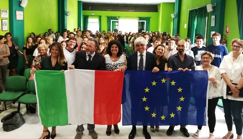 Al termine dell’intervento e prima delle foto di rito con docenti e ragazzi, il presidente Pompeo ha consegnato alla dirigente scolastica Senese le bandiere italiana ed europea per ribadire il valore della Costituzione e l’importanza di conservare e trasmettere lo spirito europeo, mentre la professoressa lo ha omaggiato con la borraccia termica, che l’istituto ha fornito a ciascuno degli studenti proprio per bandire l’utilizzo dei bicchieri in plastica.
