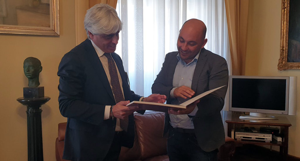Al termine del colloquio, il presidente Pompeo ha fatto dono al direttore generale Lorusso del volume ‘Arte in Provincia’, contenente tutte le opere scultoree e pittoriche esposte all’interno di Palazzo Jacobucci.