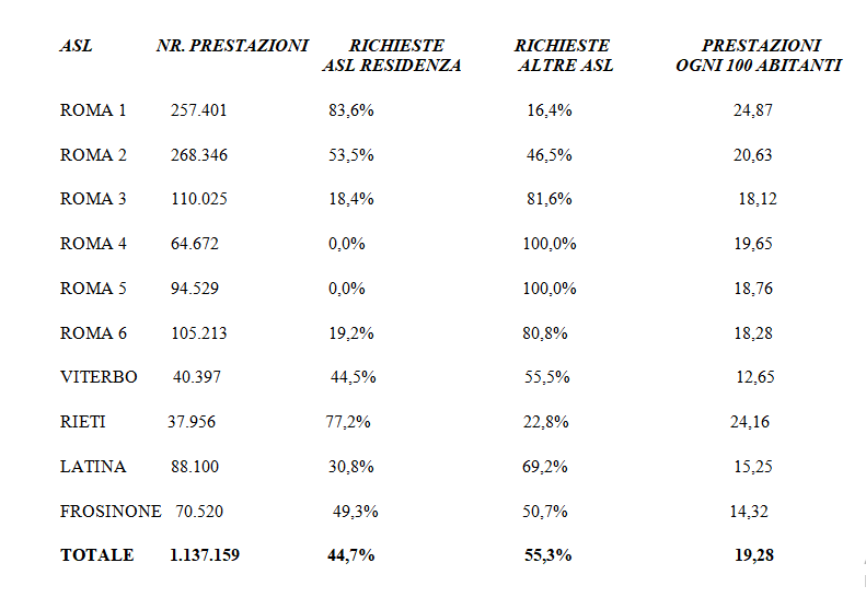 “Come è agevole constatare, dalla lettura dei dati – argomenta –  il numero di prestazioni della locale ASL, è notevolmente superiore, più del doppio, di tutte quelle delle altre province, esclusa Latina. Ma è anche, addirittura superiore, alla ASL Roma 4. E vi è di più. Frosinone ha dovuto soddisfare più del 50% di richieste provenienti da altre ASL.  E questo spiega, in parte, il dato più basso rispetto ad altri, relativo alle prestazioni ogni 100 abitanti”.