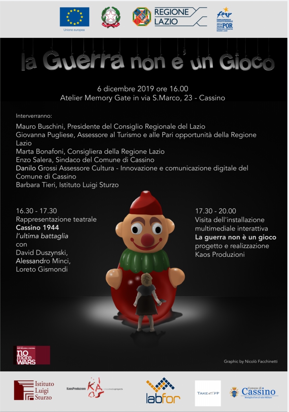 Sarà inaugurata domani, venerdì 6 dicembre, alle 16.00 presso l’Atelier Memory Gate di Cassino l’installazione multimediale interattiva ‘La guerra non è un gioco’, alla presenza di: Mauro Buschini, Presidente del Consiglio regionale del Lazio, Giovanna Pugliese, Assessore al Turismo e alle Pari opportunità della Regione Lazio, Marta Bonafoni, consigliere della Regione Lazio, Enzo Salera, Sindaco del Comune di Cassino, Danilo Grossi, Assessore Cultura – Innovazione e comunicazione digitale del Comune di Cassino, Barbara Tieri, Istituto Luigi Sturzo.