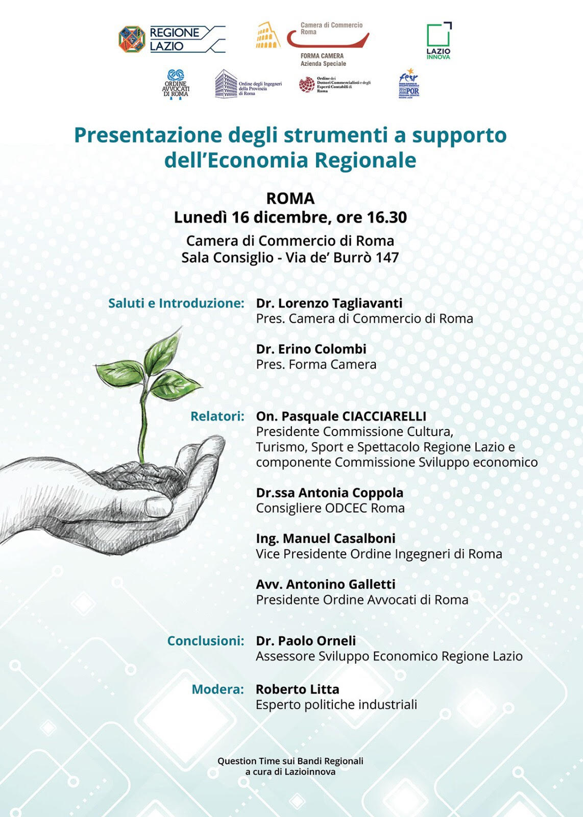 “L’obiettivo è quello di far conoscere ed approfondire tutte le misure di finanziamento erogate dalla Regione Lazio per professionisti, imprenditori e privati. All’incontro parteciperà l’Assessore Regionale alle Attività Produttive e Sviluppo Economico Paolo Orneli, insieme al presidente della Camera di Commercio di Roma, Lorenzo Tagliavanti, a Erino Colombi, presidente Forma Camera, ad Antonia Coppola, consigliere ODCEC di Roma, all’ingegner Carla Cappiello, presidente dell’ordine degli ingegneri di Roma, all’avvocato Antonino Galletti, presidente dell’Ordine degli avvocati di Roma. Modererà il dibattito Roberto Litta, esperto di politiche industriali”.
