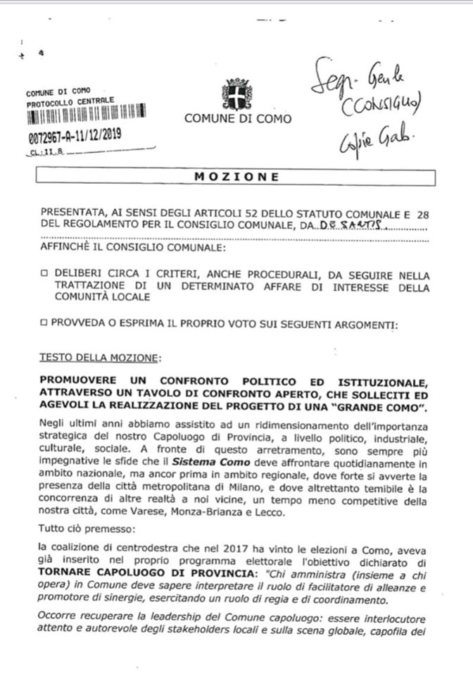 “Questo, grazie al collega Consigliere Comunale di Como Sergio De Santis, con il quale sono in contatto da tempo, e che, stimolato dalla iniziativa assunta da diversi mesi dal Consiglio Comunale di Frosinone e altri Comuni vicini, di realizzare una grande aggregazione territoriale, per acquisire maggiore competitività, lo scorso 11 dicembre ha presentato, insieme ad altri Consiglieri, una mozione, analogamente a quanto già deliberato a Frosinone, che ha come oggetto la ‘realizzazione di una grande Como’. Come noto, l’iniziativa dell’Unione dei Comuni del Frusinate per un grande Capoluogo, (avanzata da Giovanni Turriziani, presidente di Unindustria, ndr) è all’attenzione della Regione Lazio, laddove, in riposta ad una mia sollecitazione di costituire il Comitato promotore, con a capo la Regione, per la effettiva partenza del progetto, gli Uffici del Presidente Zingaretti qualche settimana fa, in riscontro alla mia nota, hanno manifestato ufficialmente interesse e disponibilità in tal senso.