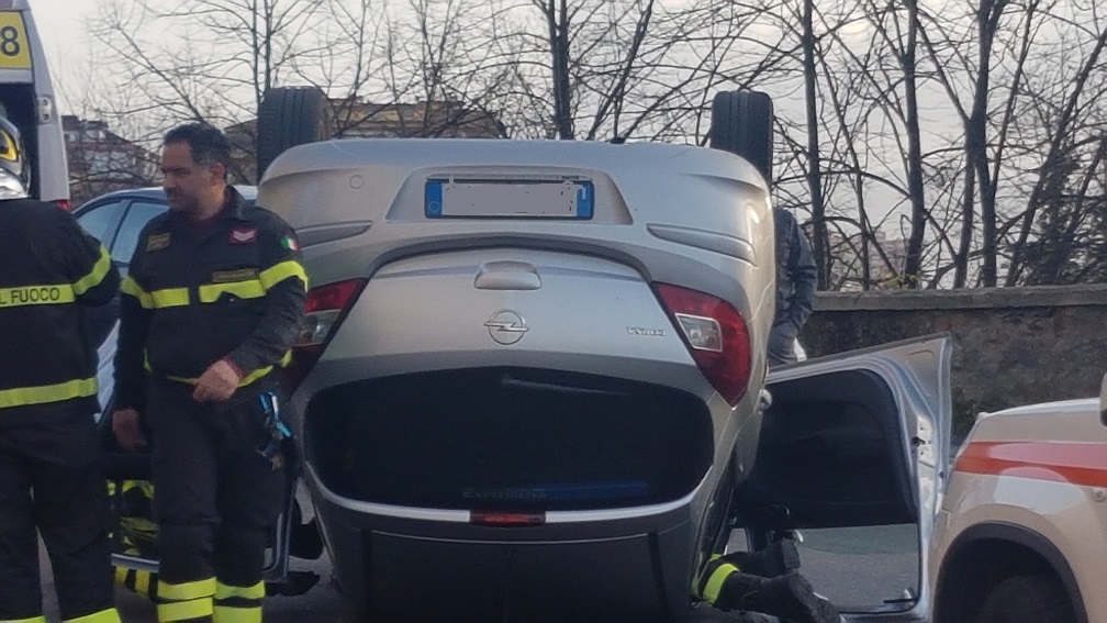 Rocambolesco incidente nel pomeriggio di oggi in pieno centro abitato a Frosinone. Un giovane si è ribaltata con la sua auto, lungo viale Mazzini, in prossimità della sede del consorzio Asi.