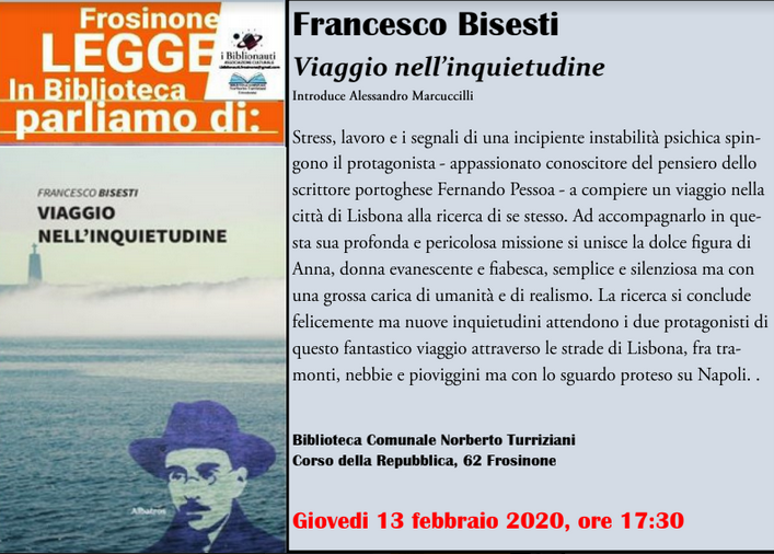 Il 13 febbraio incontreremo Francesco Bisesti con la sua “Viaggio nell’inquietudine”, a presentarlo sarà Alessandro Marcuccilli. Stress, lavoro e i segnali di una incipiente instabilità psichica spingono il protagonista, da sempre appassionato cultore del pensiero dello grande scrittore portoghese Fernando Pessoa, a compiere un viaggio nella città di Lisbona alla ricerca di se stesso. Ad accompagnarlo in questa sua profonda e pericolosa missione si unisce la dolce figura di Anna, donna evanescente e fiabesca, semplice e silenziosa ma con una grossa carica di umanità e di realismo. La ricerca si conclude felicemente ma nuove Inquietudini attendono i due protagonisti di questo fantastico viaggio attraverso le strade di Lisbona, fra tramonti, nebbie e pioviggini ma con lo sguardo proteso su Napoli.
