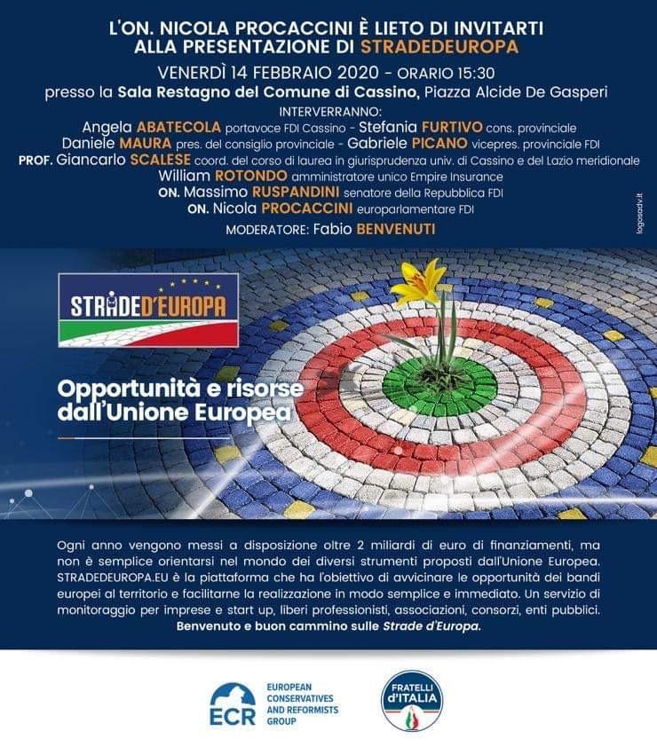 Venerdi 14 febbraio, alle ore 15.30, nella Sala Restagno del Comune di Cassino, l’onorevole Nicola Procaccini, europarlamentare eletto nelle fila di Fratelli d’Italia, presenterà il progetto denominato Strade d’Europa, relazionando sulle opportunità e sulle risorse che l’Unione Europea mette a disposizione per il territorio degli Stati membri. Tale servizio proposto da Procaccini servirà per interagire con imprese, start up, liberi professionisti, associazioni, consorzi ed enti pubblici.