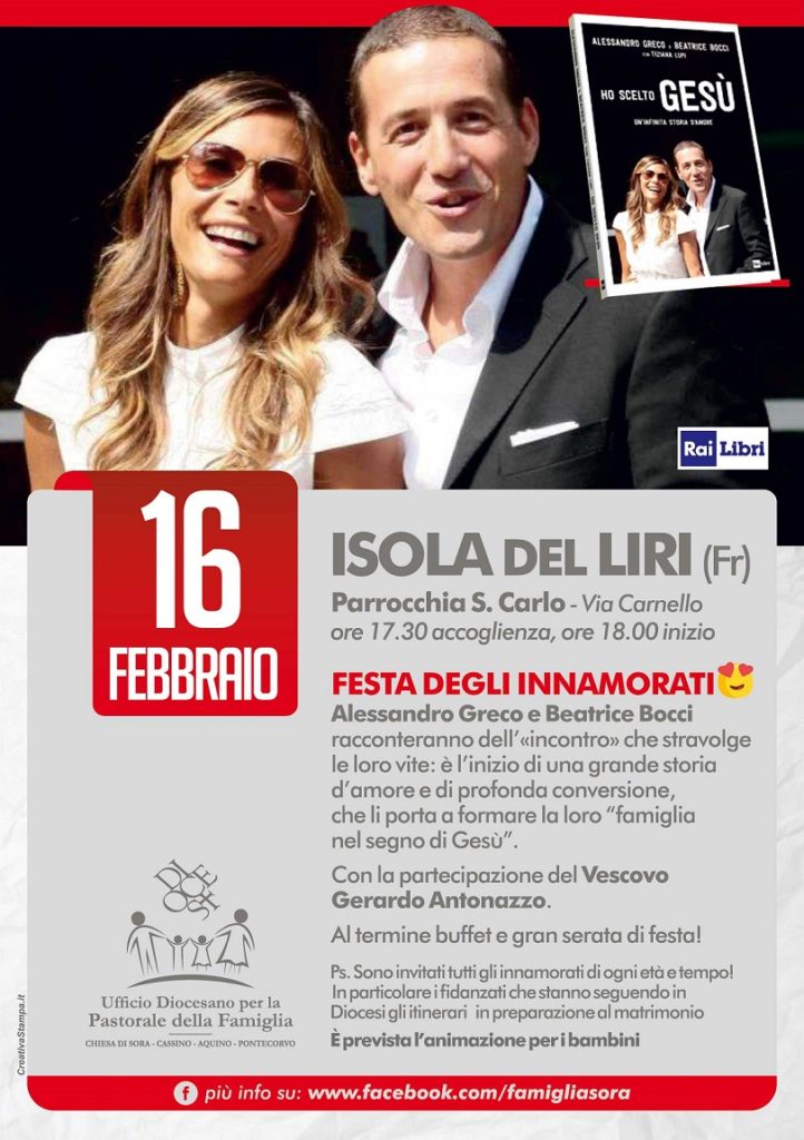 L’ufficio famiglia ha deciso di invitare in Diocesi i coniugi Greco per la ricorrenza di San Valentino, festa degli innamorati. Dopo la presentazione del libro seguirà un momento conviviale con un apericena a tema. Sono quindi invitati a partecipare tutti gli innamorati di ogni età e tempo! Ed in particolare i fidanzati che stanno seguendo in Diocesi gli itinerari in preparazione al matrimonio. All’incontro parteciperà anche il Vescovo della Diocesi Mons. Gerardo Antonazzo e il direttore dell’Ufficio Famiglia don Giovanni De Ciantis. Per ulteriori informazioni è possibile visitare la pagina www.facebook.com/famigliasora