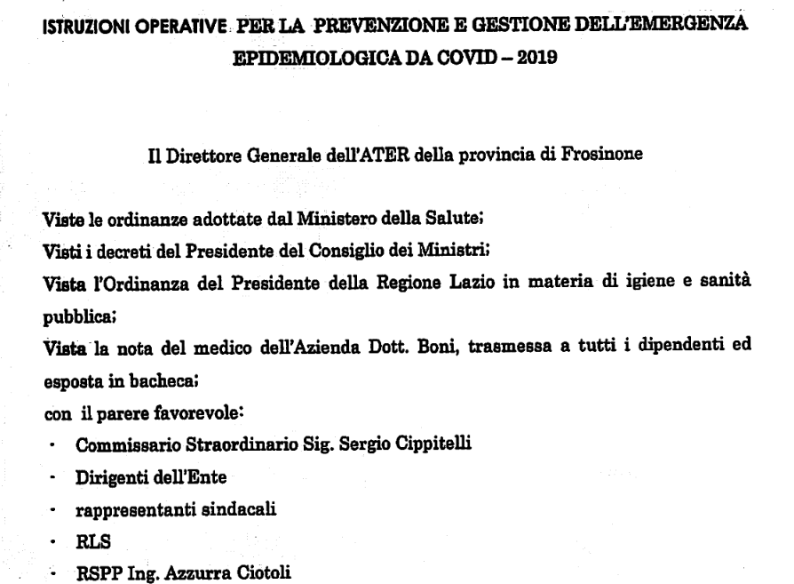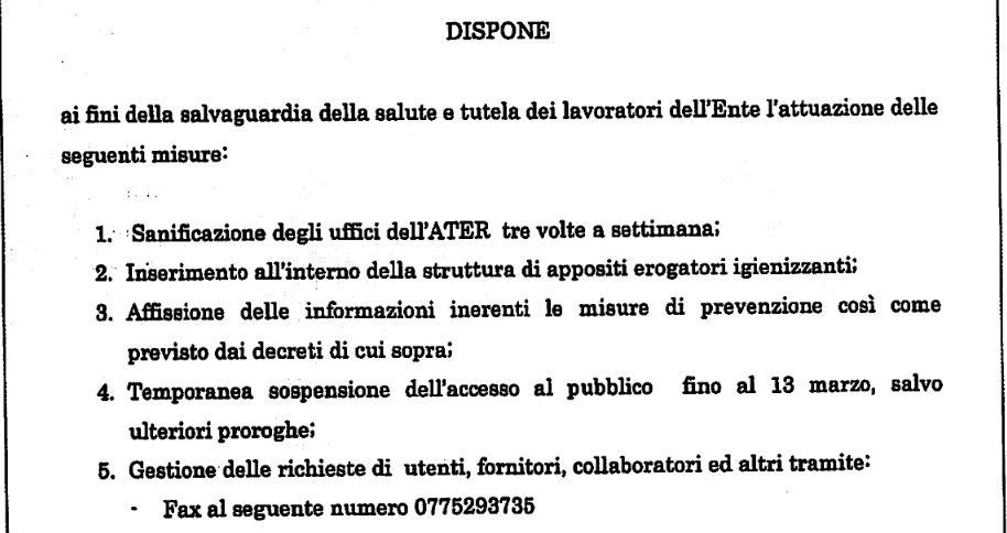Gli uffici Ater di Frosinone resteranno chiusi al pubblico fino al 13 marzo. La decisione è stata assunta dal direttore generale Alfio Montanaro, a seguito delle ordinanza del consiglio dei ministri, del ministero della salute e della Regione Lazio.