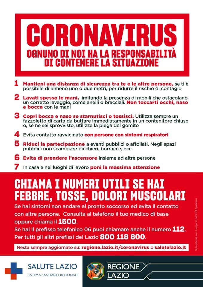 Parte la campagna d’informazione della Regione Lazio sul Coronavirus che verrà diffusa nei prossimi giorni su social, stampa quotidiana e affissa in tutto il territorio della Regione Lazio, per illustrare ai cittadini quali misure assumere per contenere la diffusione del virus.