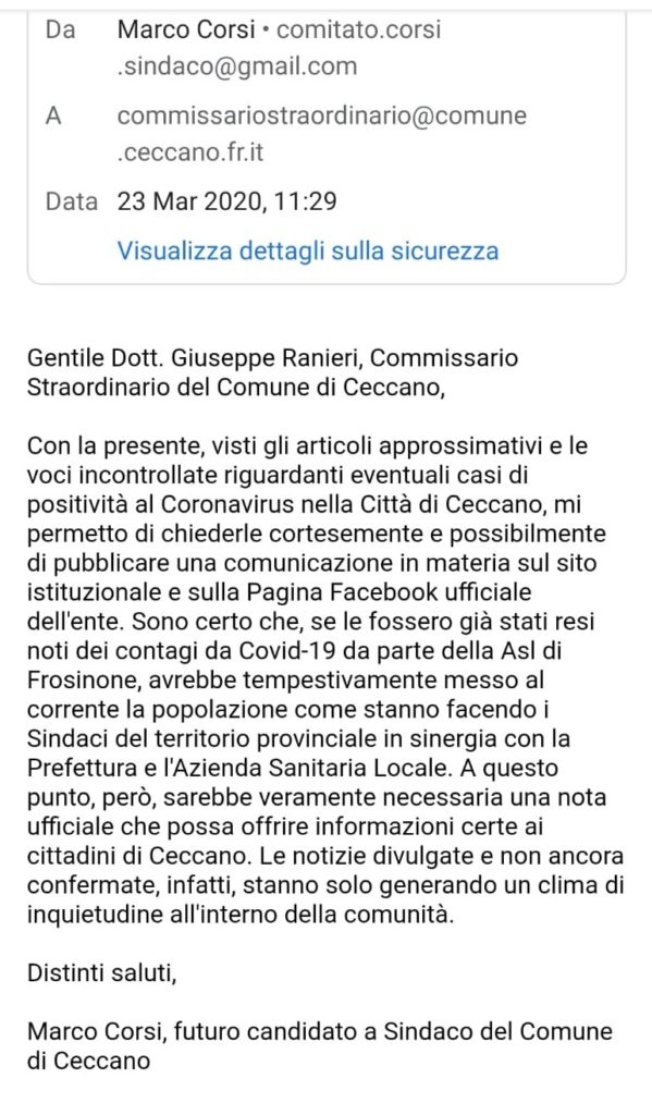 “Mi sono permesso di chiedere cortesemente ieri mattina al dottor Giuseppe Ranieri, Commissario Straordinario del Comune di Ceccano, con una nota ufficiale, di dare informazioni certe alla cittadinanza su eventuali contagi da Coronavirus, viste le voci incontrollate che stanno generando inquietudine all’interno della comunità. La mia, al contrario di altri, non è mancanza di fiducia nell’attuale autorità sanitaria locale, perché sono sicuro che il Commissario Prefettizio avrebbe già informato i ceccanesi se la Asl di Frosinone avesse segnalato casi confermati di positività”. Così Marco Corsi, futuro candidato sindaco di Ceccano.