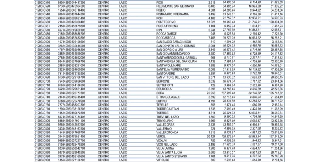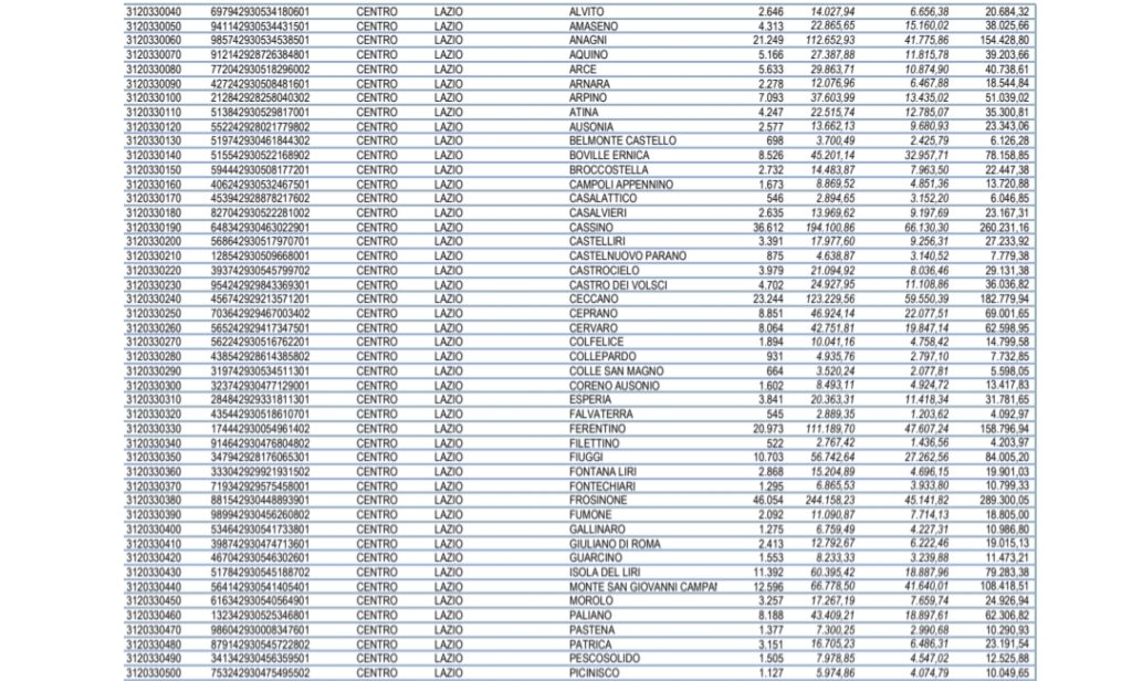 Frosinone otterrà 289 mila euro, Cassino 260 mila, Alatri 229 mila, Sora 195 mila, Veroli 177 mila, Ceccano 182 mila, Ferentino 158 mila, Anagni 154 mila, Monte San Giovanni Campano 108 mila, Pontecorvo 100 mila, Isola del Liri 79 mila, Boville 78 mila, Ceprano 69 mila.