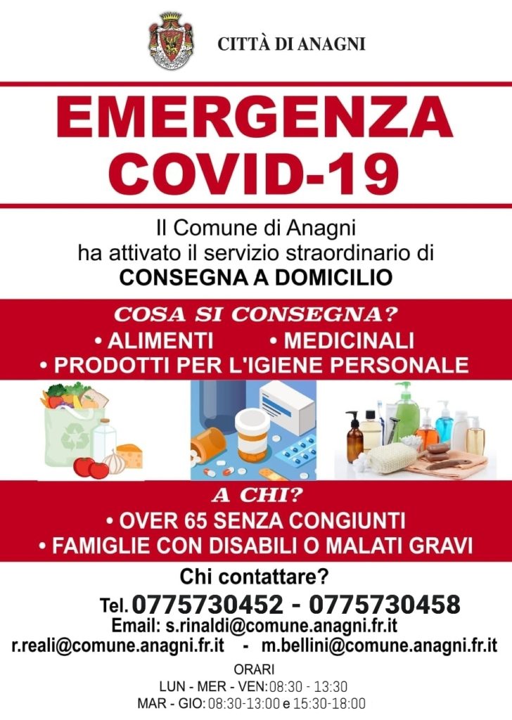 Attivato ad Anagni il servizio di prenotazione e consegna della spesa a domicilio. A chi è destinato?: over 65 senza congiunti; famiglie con disabili o persone con patologie gravi. Cosa si consegna?: generi alimentari, medicinali, prodotti per la cura della persona