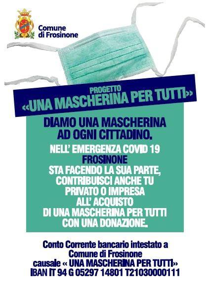 “Non finiremo mai di ringraziare quei donatori e quei privati che, in questi giorni, stano contribuendo, a seconda di quel che possono, attraverso i bonifici al contro corrente del Comune, a centrare un obiettivo, insieme agli stanziamenti finanziari del municipio, che pone al centro dell’attenzione ogni singolo cittadino con i suoi bisogni primari, come la sicurezza e la salute”. Per coloro che vorranno contribuire al progetto “Una mascherina per tutti”, sarà possibile continuare, anche nei prossimi giorni, ad effettuare eventuali versamenti e donazioni al Conto Corrente bancario intestato al Comune di Frosinone (IBAN IT 94 G 05297 14801 T21030000111), con la causale «Una Mascherina Per Tutti”.
