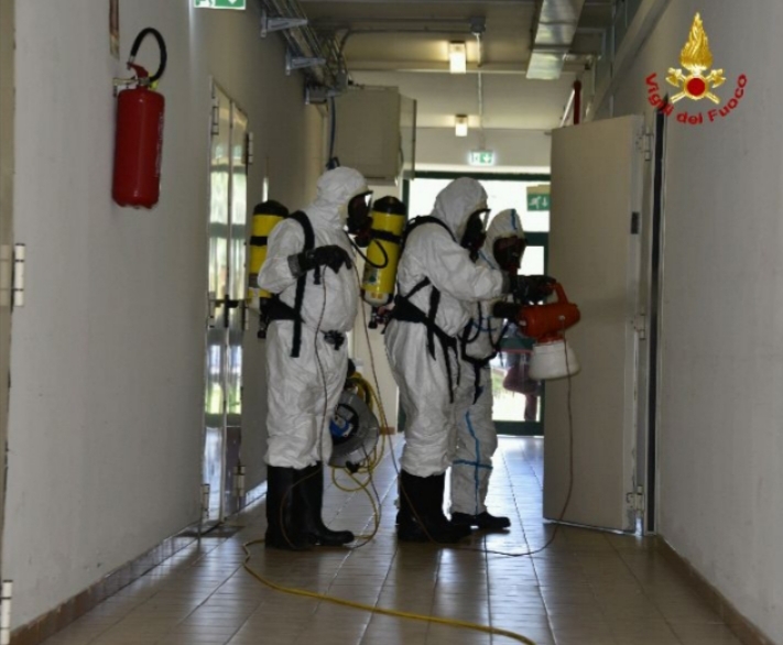 Dopo aver delimitato le aree di intervento i vigili del fuoco hanno operato per circa cinque ore e sono stati sanificati circa 900 mq di superficie coperta.