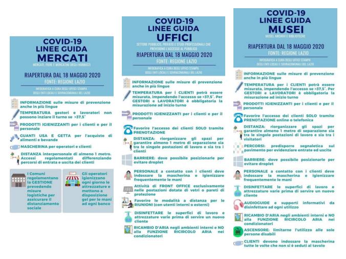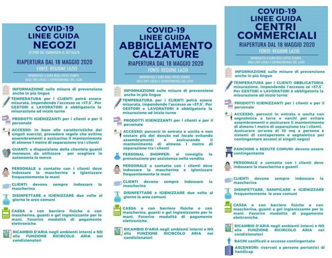 Si fa inoltre presente che le linee guida per la riapertura delle attività economiche, produttive e ricreative in forma dettagliata sono state emanate previa Ordinanza Regionale 16 maggio 2020 n. Z00041 scaricabile qui e che invitiamo caldamente a consultare: https://www.regione.lazio.it/binary/rl_main/tbl_news/Ordinanza_Z00041_16_05_2020.pdf. Le linee guida e d’indirizzo per i commercianti si trovano da Pag. 9 a Pag. 28 divise per settori, rispettivamente: