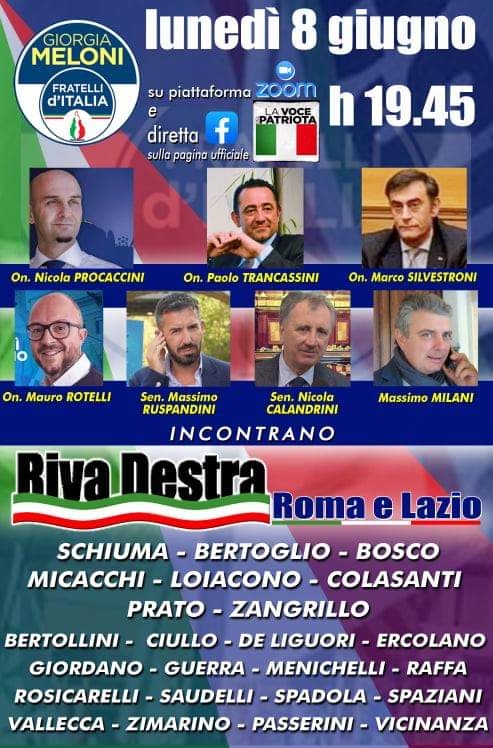 Continuano gli appuntamenti di Riva Destra (movimento federato con Fratelli d’Italia) tesi ad incontrare e sostenere l’azione politica degli eletti e dei dirigenti di Fratelli d’Italia nei territori di competenza. Dibattito alle 19.45 di oggi, lunedì 8 giugno, sulla piattaforma zoom.