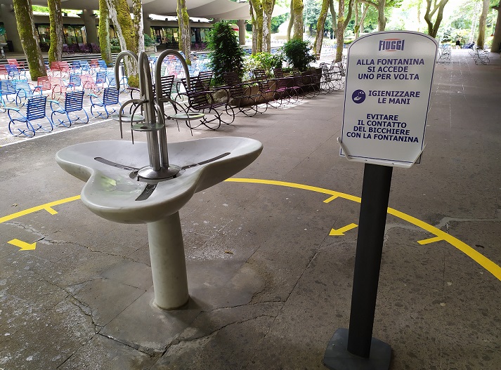 I clienti, soltanto uno alla volta, potranno prendere l’acqua curativa dalle fontanelle. All’ingresso c’è il personale addetto che provvede alla misurazione della temperatura corporea e stesse modalità dovranno essere seguite per effettuare le ‘impegnative’ presso la sala medica.