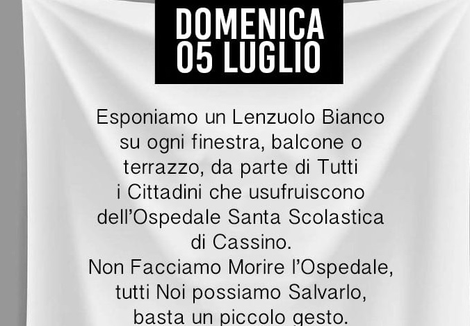 Si inizierà domenica 5 luglio, con una manifestazione pacifica, nel pieno rispetto delle norme e senza colori politici a difesa dell’ospedale Santa Scolastica di Cassino. “Sarà un semplice gesto simbolico – spiega – che dimostrerà la voglia e la forza di difendere una struttura che rappresenta la speranza di salute di un intero territorio. Un ospedale di confine che doveva essere un Dea di I livello e soprattutto con un’utenza di oltre 150 mila persone. Esponiamo un semplice lenzuolo bianco, che rappresenta il dolore di ogni singolo cittadino di questo territorio quasi sempre violentato e sacrificato. Ogni cittadino, di ogni singolo comune di questo territorio dovrà dimostrare di tenere alla propria salute, perché è il bene più prezioso che abbiamo. Mi aspetto paesi inondati di bianco”.