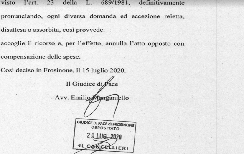 Il giudice di pace di Frosinone, Emilio Manganiello, con la decisione 516/2020 del 15/07/20 depositata in data 29/07/20, ha deciso di annullare l’ammenda di oltre 400 euro nei confronti di due persone.