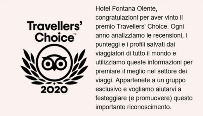 Con grande gioia e orgoglio l’Hotel Fontana Olente Terme Pompeo ha annunciato di aver ricevuto il premio Travellers’ Choice 2020 di Tripadvisor per la categoria alberghi. Dopo un anno davvero difficile, i vincitori di questo prestigioso riconoscimento, desiderano ringraziare tutti i viaggiatori che hanno consentito loro di essere nel 10% dei migliori alberghi al mondo.