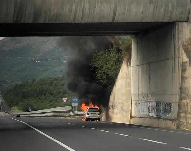 L’auto va in fiamme sulla ‘Frosinone-Mare’, salvato dalla polizia stradale