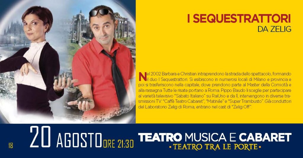Questa sera sarà la volta dello spettacolo di cabaret dei Sequestrattori. Nel 2002 Barbara e Christian intraprendono la strada dell’intrattenimento, formando il duo comico. Si esibiscono in numerosi locali di Milano e provincia e poi si trasferiscono nella capitale, dove prendono parte al Master della Comicità e alla rassegna Tutte le risate portano a Roma. Pippo Baudo li sceglie per partecipare al varietà televisivo “Sabato Italiano” su RaiUno e da lì, intervengono in diverse trasmissioni TV: “Caffè Teatro Cabaret”, “Matinée” e “Super Trambusto”. Già conduttori del Laboratorio Zelig di Roma, entrano nel cast di “Zelig Off”.