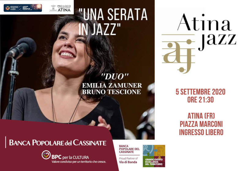 Sabato 5 settembre 2020 alle ore 21.30 in Piazza Marconi ad Atina (FR), una speciale serata organizzata dall’Atina Jazz Festival, che avrà come protagonisti Emilia Zamuner e il chitarrista e musicista salernitano, Bruno Tescione.