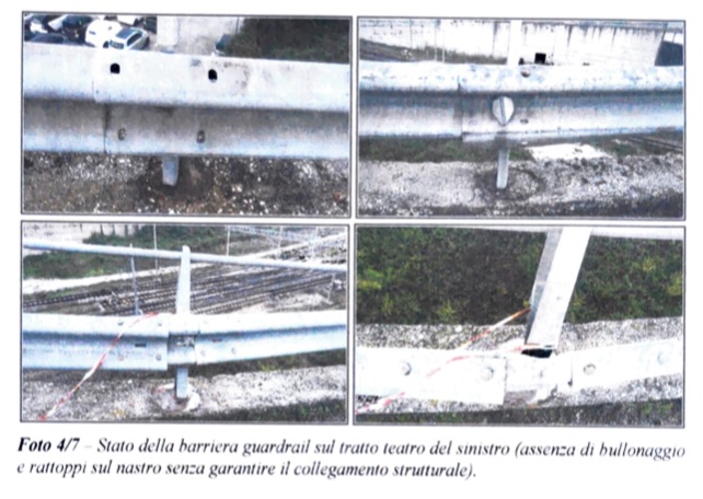 Era parso evidente da subito che i dispositivi di trattenuta su quel cavalcavia erano lacunosi. Ispezionando il tratto in questione, transennato dai carabinieri della locale stazione, è emerso chiaro che le barriere erano sì fissate con un perno ai sostegni piantati a terra sul cemento, ma che i fascioni non erano collegati tra loro con i relativi bulloni di fissaggio, mancanti quasi del tutto, specie sul lato dove la vettura è precipitata.