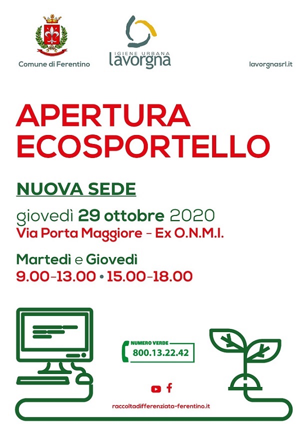 Intanto l’Amministrazione comunale di Ferentino fa sapere che giovedì 29 ottobre 2020 aprirà l’ecosportello della Lavorgna nei locali di via Porta Maggiore (ex O.n.m.i.), una nuova sede presso la quale gli utenti si potranno rivolgere per informazioni e necessità nei giorni di martedì e giovedì, dalle 9 alle 13 e dalle 15 alle 18, nel rispetto di tutte le misure di sicurezza previste dalla normativa anti-Covid.