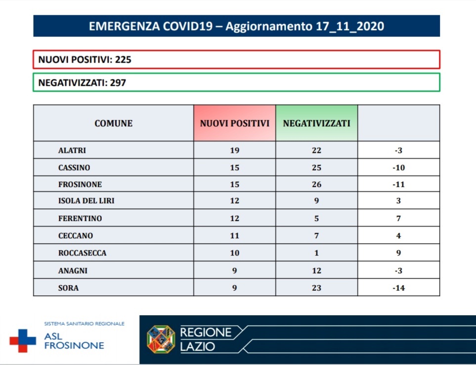 Nella Asl di Frosinone si registrano 225 nuovi contagi e si tratta di casi isolati a domicilio, contatti di un caso già noto o con link familiare. Quattro i decessi di 48, 61, 63 e 84 anni con patologie.